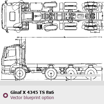 Raster blueprint of the GINAF X 4345 TS 8x6 Heavy Truck. This free downloadable image can be used for graphic projects, digital design, and 3D modeling. The file provides accurate exterior proportions of the vehicle. Body type: Heavy Truck.