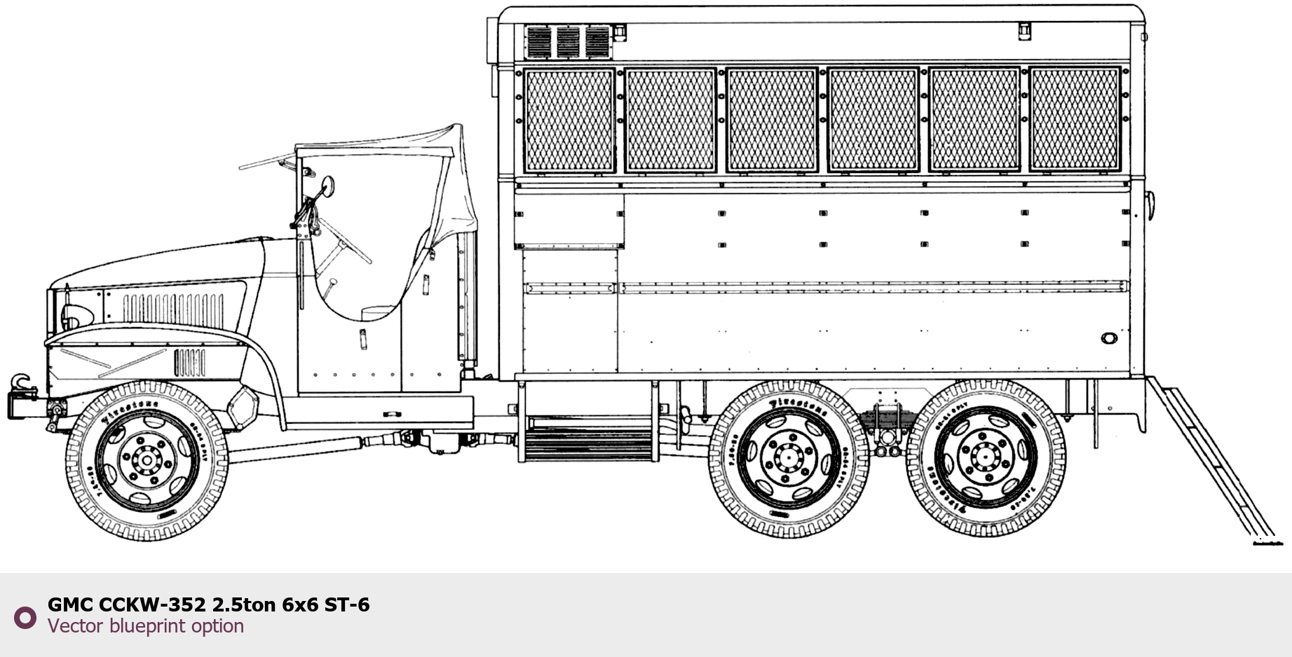 Raster blueprint of the GMC CCKW-352 2.5ton 6x6 ST-6 Heavy Truck. This free downloadable image can be used for graphic projects, digital design, and 3D modeling. The file provides accurate exterior proportions of the vehicle. Body type: Heavy Truck.