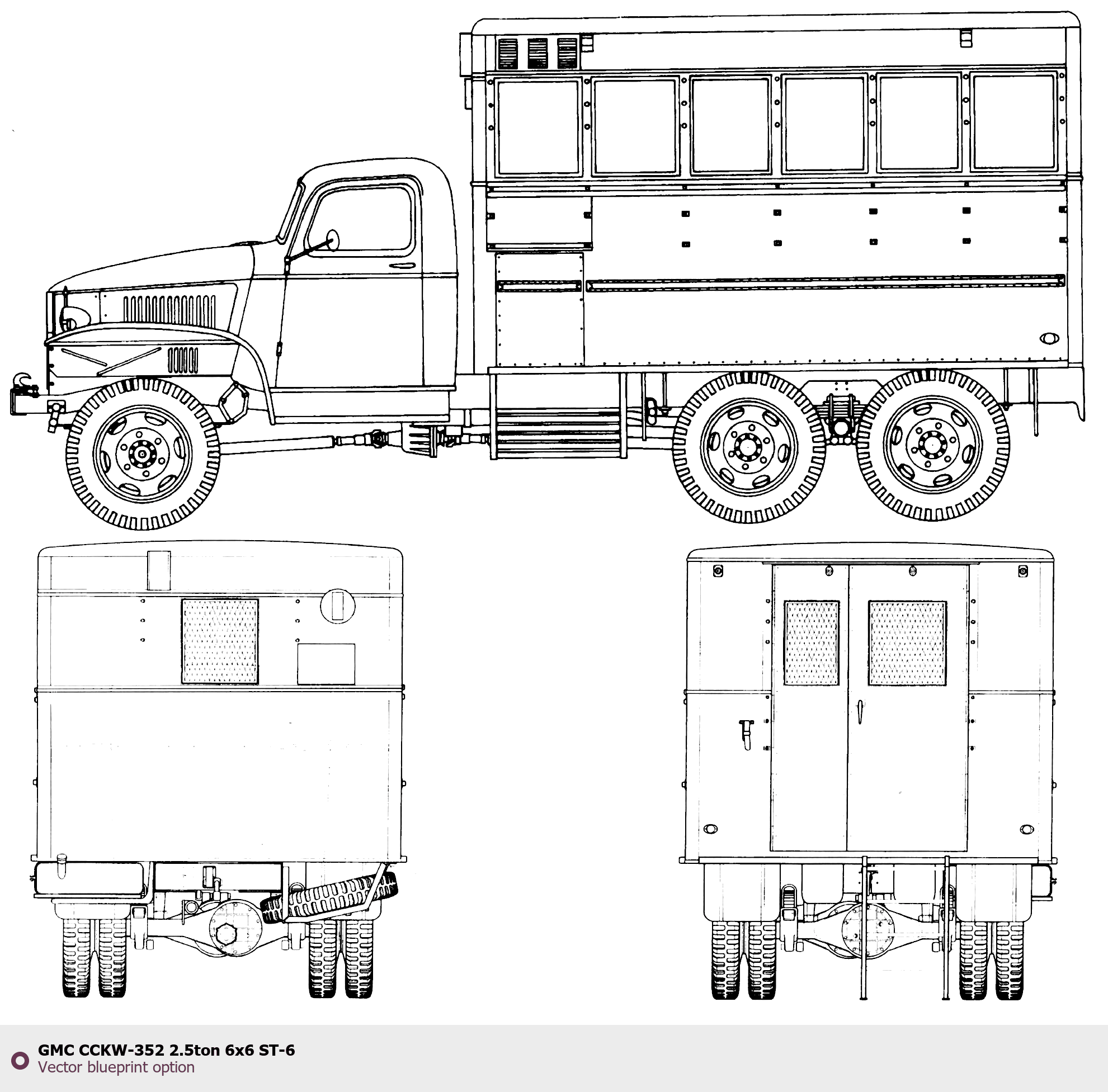 Raster blueprint of the GMC CCKW-352 2.5ton 6x6 ST-6 Heavy Truck. This free downloadable image can be used for graphic projects, digital design, and 3D modeling. The file provides accurate exterior proportions of the vehicle. Body type: Heavy Truck.