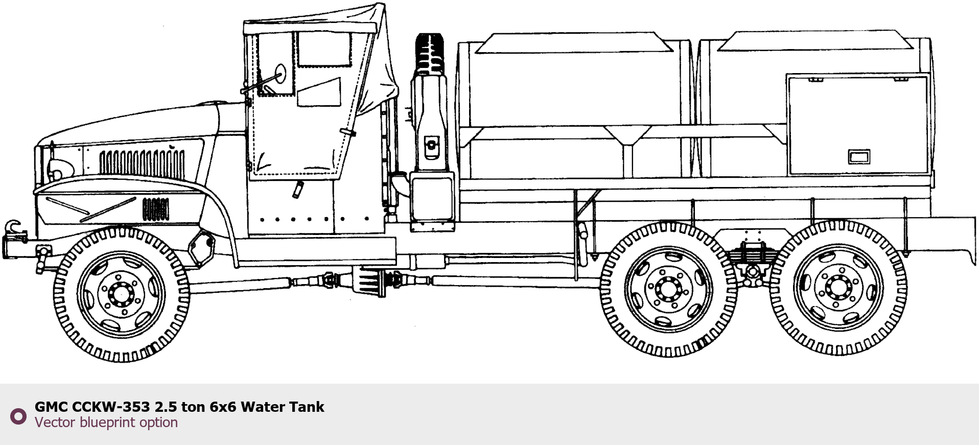 Raster blueprint of the GMC CCKW-353 2.5 ton 6x6 Water Tank Heavy Truck. This free downloadable image can be used for graphic projects, digital design, and 3D modeling. The file provides accurate exterior proportions of the vehicle. Body type: Heavy Truck.