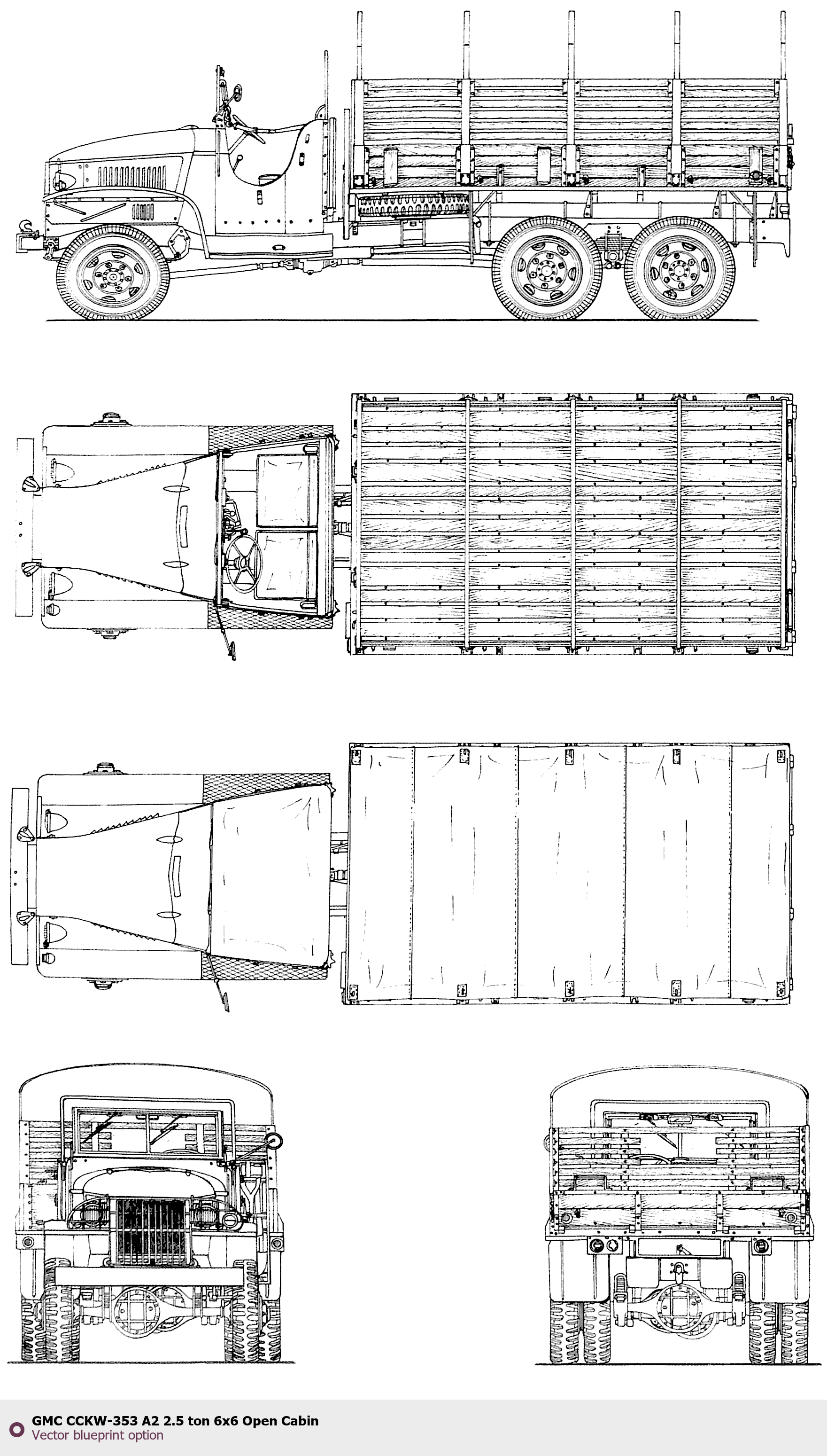 Raster blueprint of the GMC CCKW-353 A2 2.5 ton 6x6 Open Cabin Heavy Truck. This free downloadable image can be used for graphic projects, digital design, and 3D modeling. The file provides accurate exterior proportions of the vehicle. Body type: Heavy Truck.