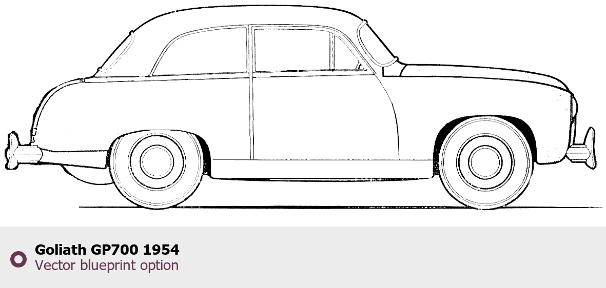 Raster blueprint of the 1954 Goliath GP700 Tag. This free downloadable image can be used for graphic projects, digital design, and 3D modeling. The file provides accurate exterior proportions of the vehicle. Model year: 1954. Body type: Tag.