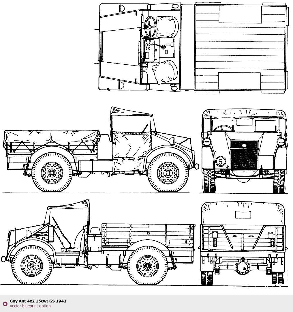 Raster blueprint of the 1942 Guy Ant 4x2 15cwt GS Heavy Truck. This free downloadable image can be used for graphic projects, digital design, and 3D modeling. The file provides accurate exterior proportions of the vehicle. Model year: 1942. Body type: Heavy Truck.