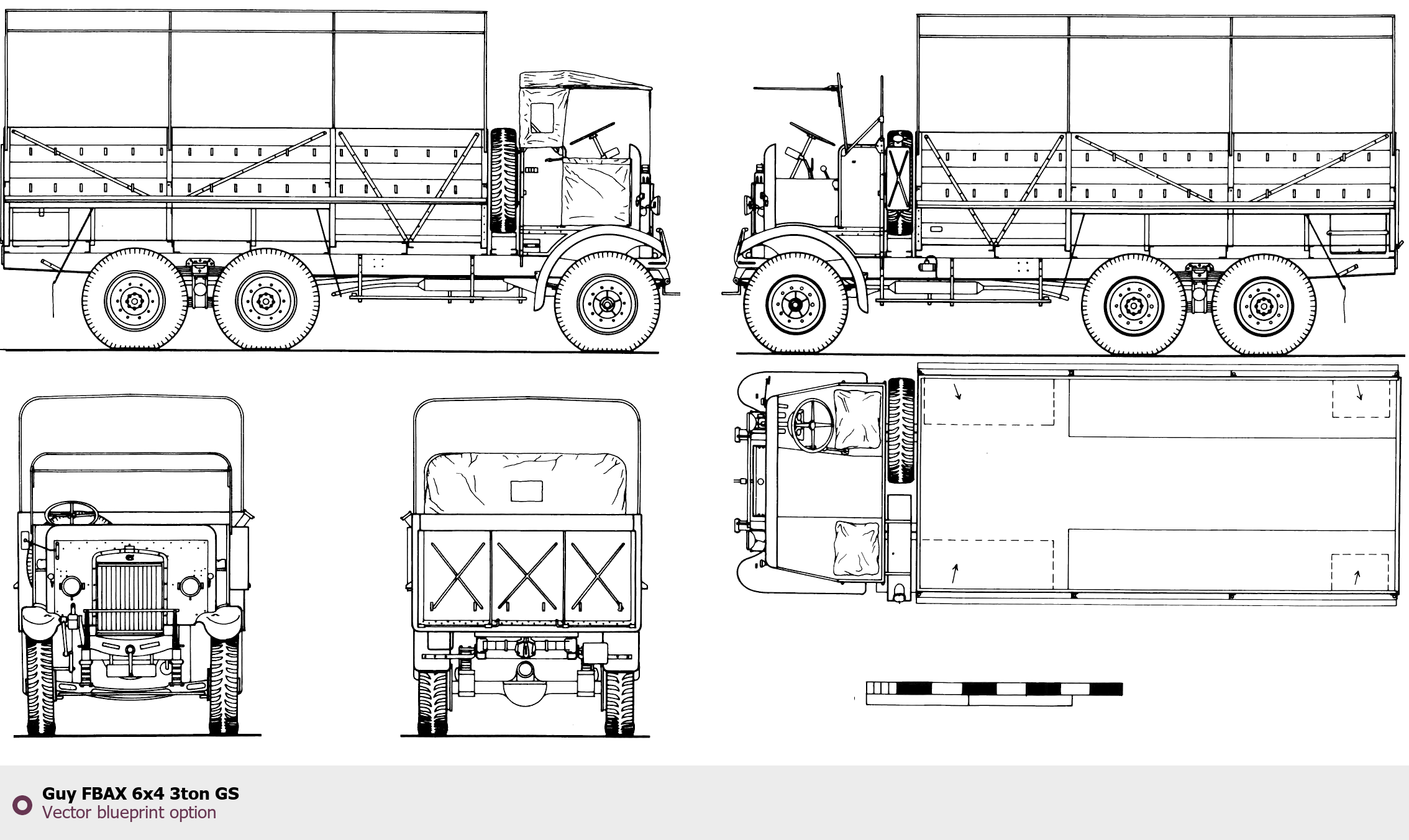 Raster blueprint of the Guy FBAX 6x4 3ton GS Heavy Truck. This free downloadable image can be used for graphic projects, digital design, and 3D modeling. The file provides accurate exterior proportions of the vehicle. Body type: Heavy Truck.