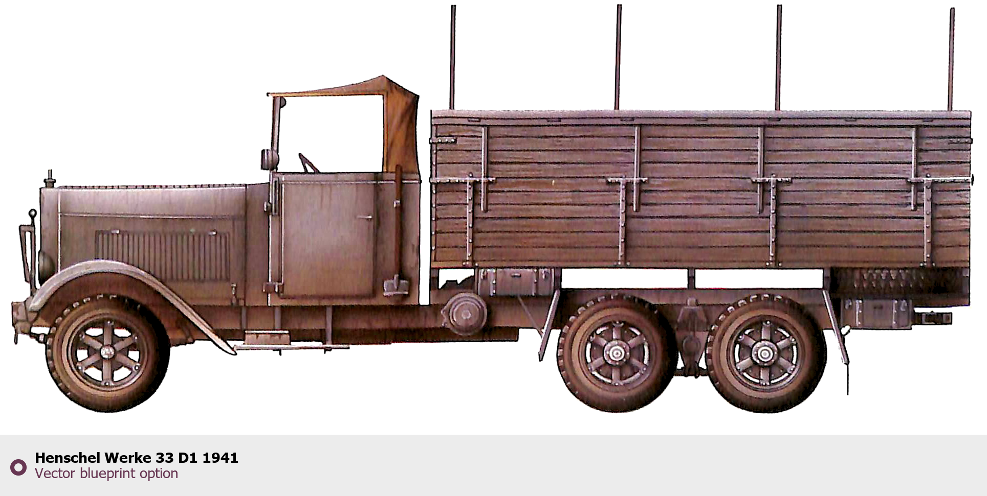 Raster blueprint of the Henschel Werke 33 D1 1941 Heavy Truck. This free downloadable image can be used for graphic projects, digital design, and 3D modeling. The file provides accurate exterior proportions of the vehicle. Body type: Heavy Truck.