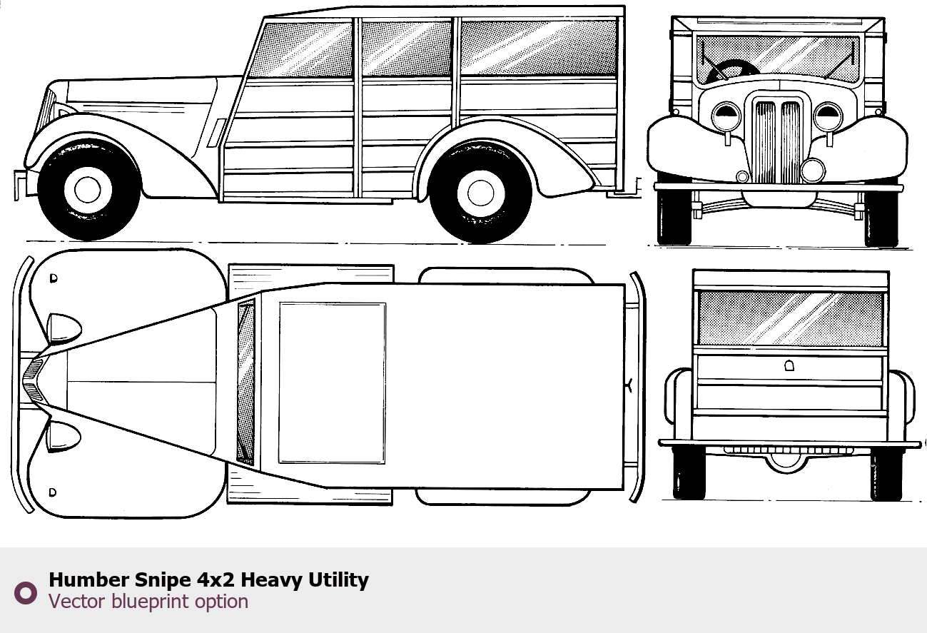Raster blueprint of the Humber Snipe 4x2 Heavy Utility Tag. This free downloadable image can be used for graphic projects, digital design, and 3D modeling. The file provides accurate exterior proportions of the vehicle. Body type: Tag.