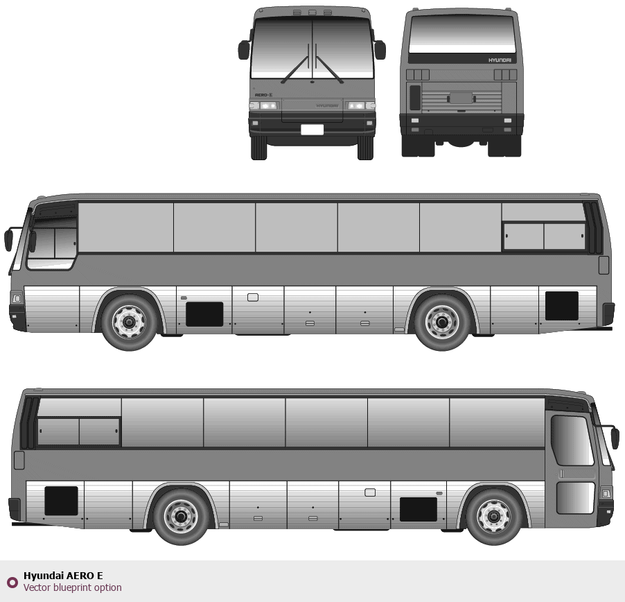 Raster blueprint of the Hyundai AERO E Bus. This free downloadable image can be used for graphic projects, digital design, and 3D modeling. The file provides accurate exterior proportions of the vehicle. Body type: Bus.