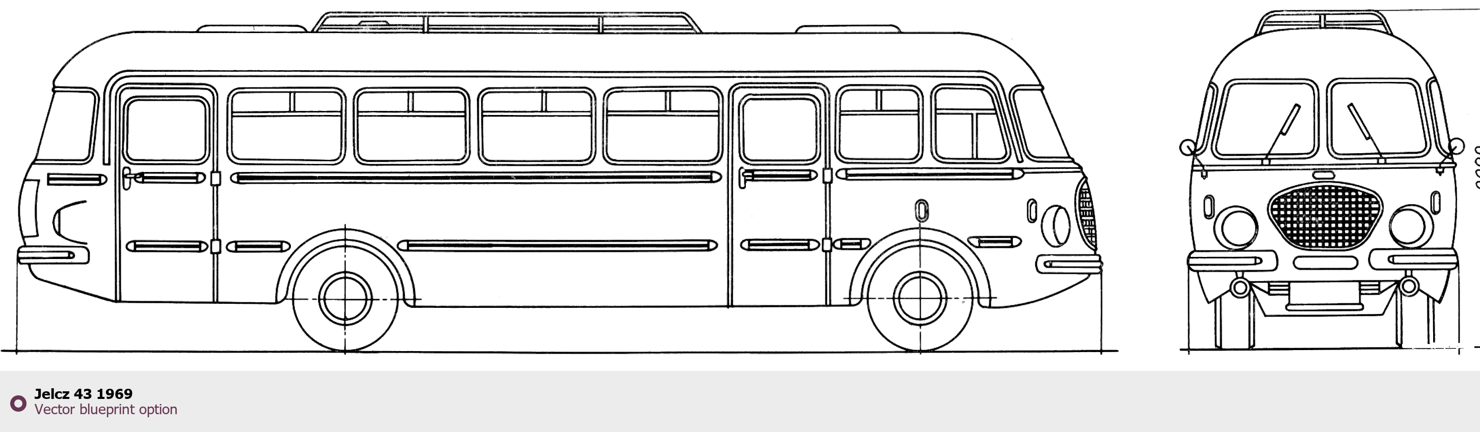 Raster blueprint of the 1969 Jelcz 43 Bus. This free downloadable image can be used for graphic projects, digital design, and 3D modeling. The file provides accurate exterior proportions of the vehicle. Model year: 1969. Body type: Bus.