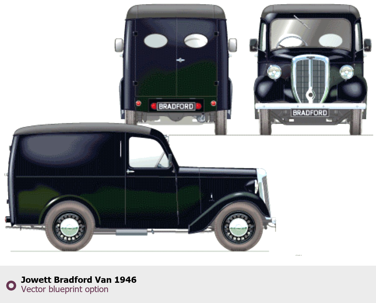 Raster blueprint of the 1946 Jowett Bradford Van Van. This free downloadable image can be used for graphic projects, digital design, and 3D modeling. The file provides accurate exterior proportions of the vehicle. Model year: 1946. Body type: Van.