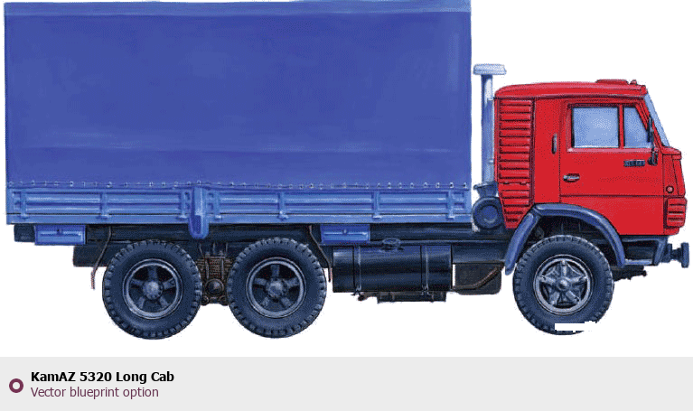Raster blueprint of the KamAZ 5320 Long Cab Heavy Truck. This free downloadable image can be used for graphic projects, digital design, and 3D modeling. The file provides accurate exterior proportions of the vehicle. Body type: Heavy Truck.