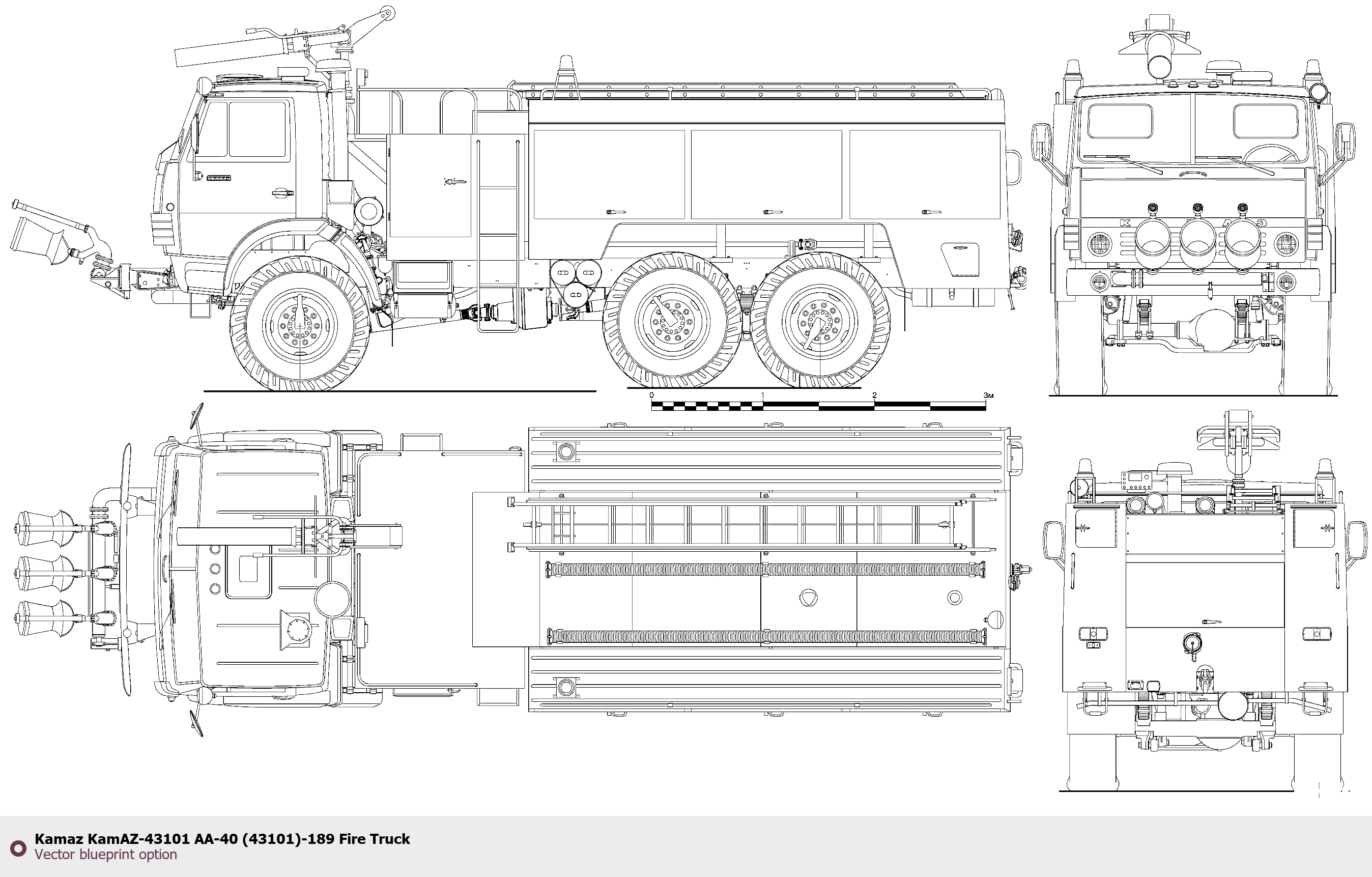 Raster blueprint of the KamAZ KamAZ-43101 AA-40 (43101)-189 Fire Truck Heavy Truck. This free downloadable image can be used for graphic projects, digital design, and 3D modeling. The file provides accurate exterior proportions of the vehicle. Body type: Heavy Truck.