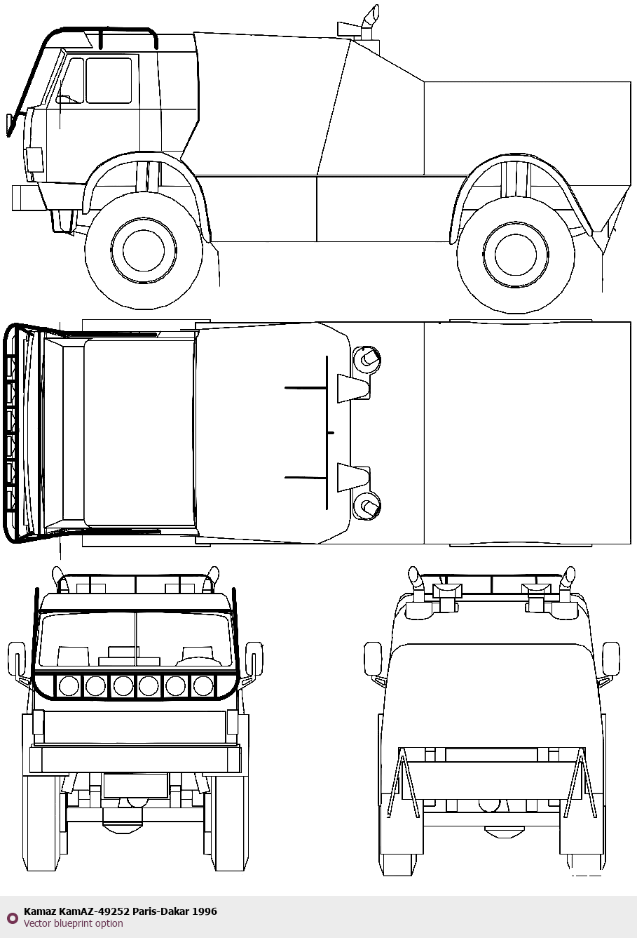 Raster blueprint of the 1996 KamAZ KamAZ-49252 Paris-Dakar Heavy Truck. This free downloadable image can be used for graphic projects, digital design, and 3D modeling. The file provides accurate exterior proportions of the vehicle. Model year: 1996. Body type: Heavy Truck.