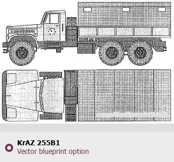 Raster blueprint of the KrAZ 255B1 Heavy Truck. This free downloadable image can be used for graphic projects, digital design, and 3D modeling. The file provides accurate exterior proportions of the vehicle. Body type: Heavy Truck.