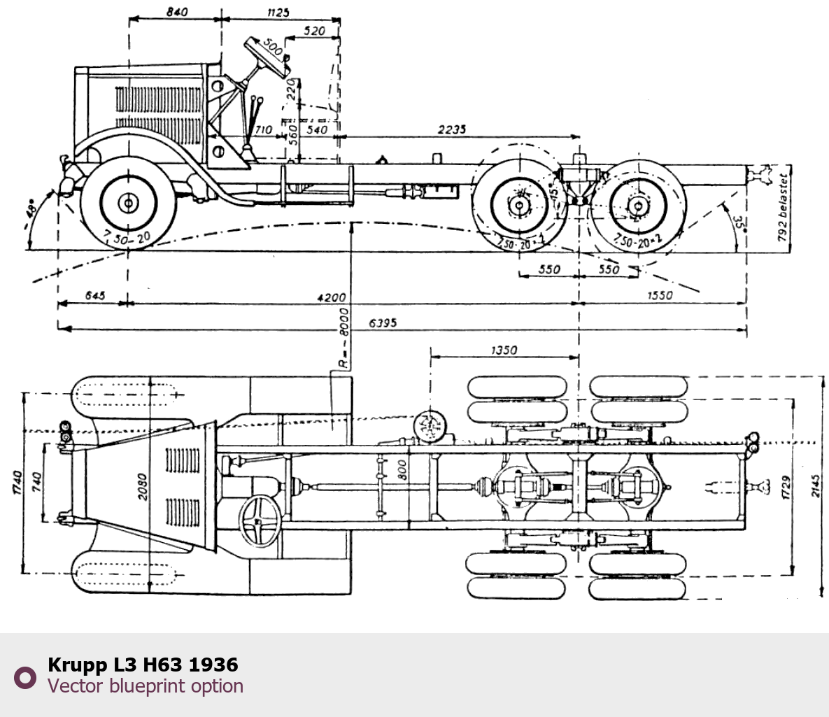 Raster blueprint of the 1936 Krupp L3 H63 Heavy Truck. This free downloadable image can be used for graphic projects, digital design, and 3D modeling. The file provides accurate exterior proportions of the vehicle. Model year: 1936. Body type: Heavy Truck.