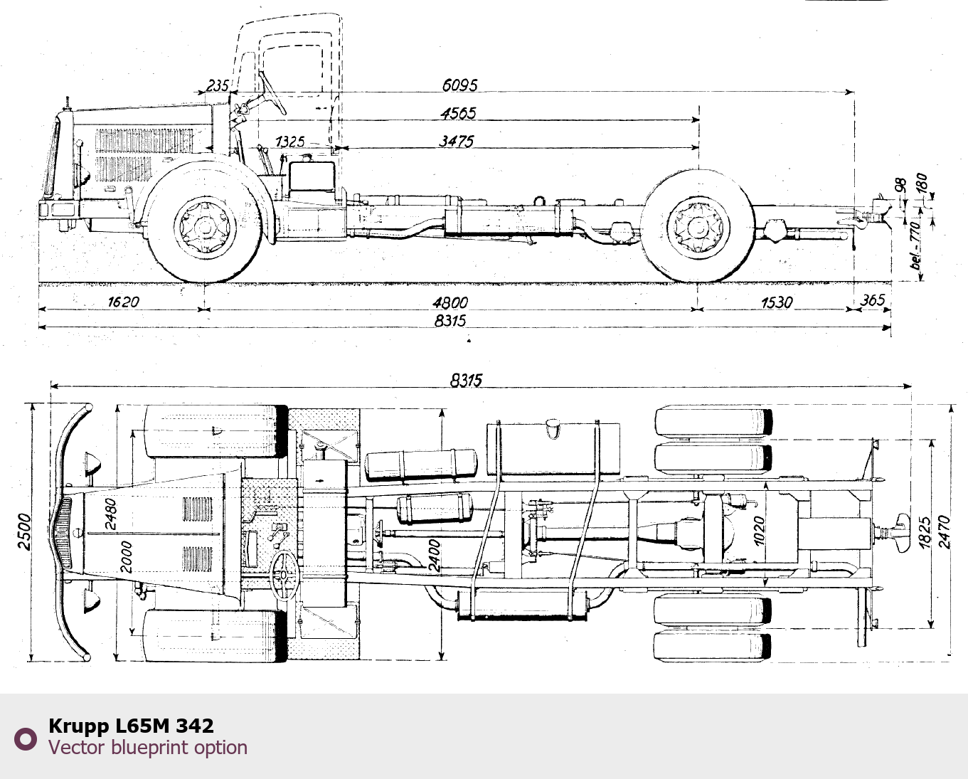 Raster blueprint of the Krupp L65M 342 Heavy Truck. This free downloadable image can be used for graphic projects, digital design, and 3D modeling. The file provides accurate exterior proportions of the vehicle. Body type: Heavy Truck.