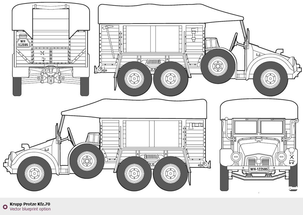 Raster blueprint of the Krupp Protze Kfz.70 Heavy Truck. This free downloadable image can be used for graphic projects, digital design, and 3D modeling. The file provides accurate exterior proportions of the vehicle. Body type: Heavy Truck.
