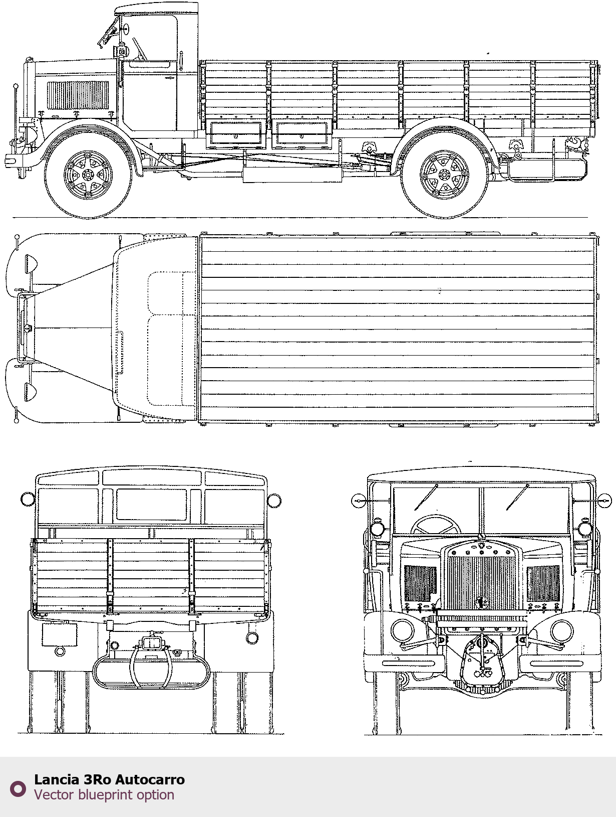 Raster blueprint of the Lancia 3Ro Autocarro Heavy Truck. This free downloadable image can be used for graphic projects, digital design, and 3D modeling. The file provides accurate exterior proportions of the vehicle. Body type: Heavy Truck.