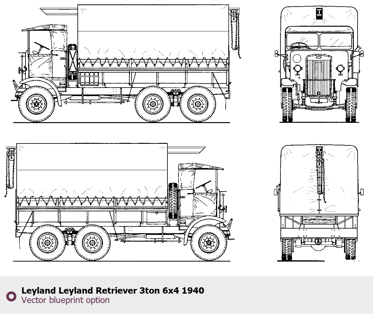 Raster blueprint of the 1940 Leyland Motors Retriever 3ton 6x4 Heavy Truck. This free downloadable image can be used for graphic projects, digital design, and 3D modeling. The file provides accurate exterior proportions of the vehicle. Model year: 1940. Body type: Heavy Truck.