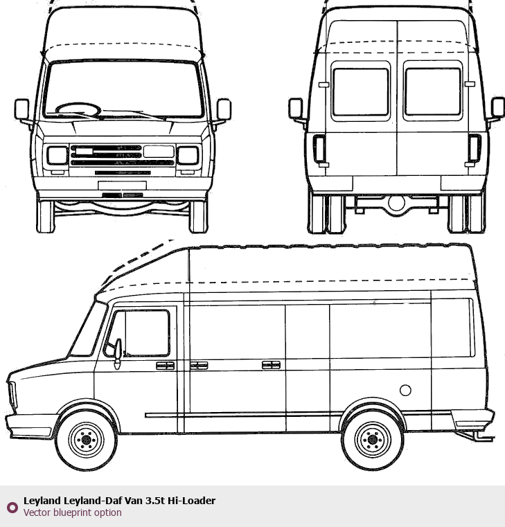 Raster blueprint of the Leyland Motors Leyland-Daf Van 3.5t Hi-Loader Van. This free downloadable image can be used for graphic projects, digital design, and 3D modeling. The file provides accurate exterior proportions of the vehicle. Body type: Van.