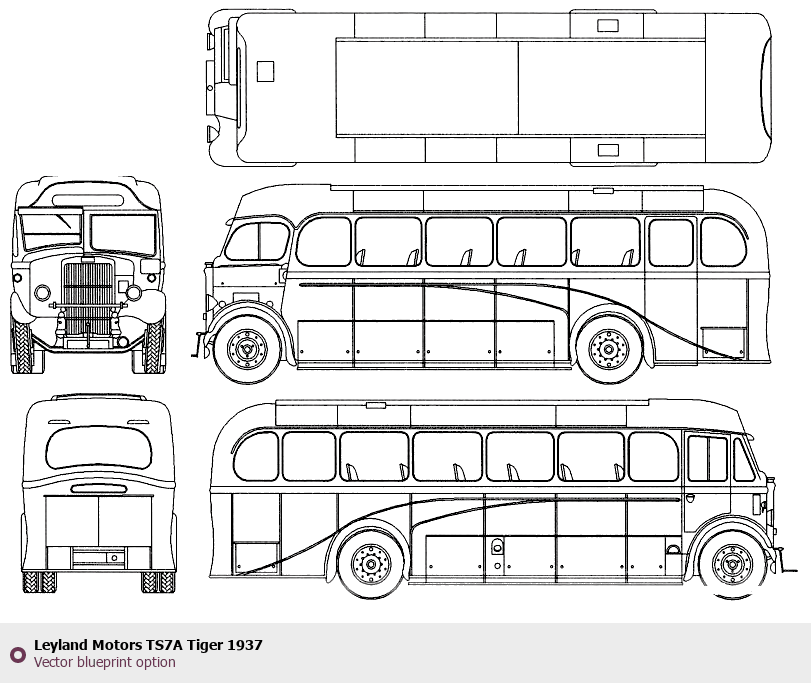 Raster blueprint of the 1937 Leyland Motors TS7A Tiger Bus. This free downloadable image can be used for graphic projects, digital design, and 3D modeling. The file provides accurate exterior proportions of the vehicle. Model year: 1937. Body type: Bus.