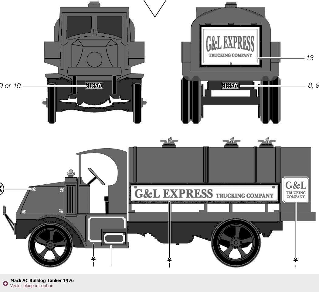 Raster blueprint of the 1926 Mack AC Bulldog Tanker Heavy Truck. This free downloadable image can be used for graphic projects, digital design, and 3D modeling. The file provides accurate exterior proportions of the vehicle. Model year: 1926. Body type: Heavy Truck.