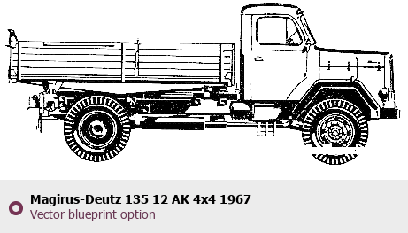 Raster blueprint of the 1967 Magirus-Deutz 135 12 AK 4x4 Heavy Truck. This free downloadable image can be used for graphic projects, digital design, and 3D modeling. The file provides accurate exterior proportions of the vehicle. Model year: 1967. Body type: Heavy Truck.
