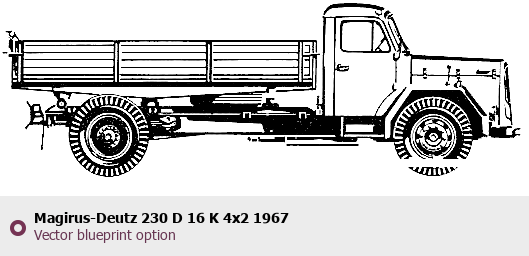 Raster blueprint of the 1967 Magirus-Deutz 230 D 16 K 4x2 Heavy Truck. This free downloadable image can be used for graphic projects, digital design, and 3D modeling. The file provides accurate exterior proportions of the vehicle. Model year: 1967. Body type: Heavy Truck.