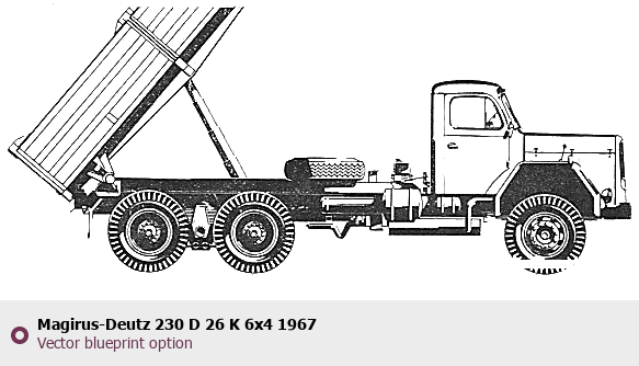 Raster blueprint of the 1967 Magirus-Deutz 230 D 26 K 6x4 Heavy Truck. This free downloadable image can be used for graphic projects, digital design, and 3D modeling. The file provides accurate exterior proportions of the vehicle. Model year: 1967. Body type: Heavy Truck.