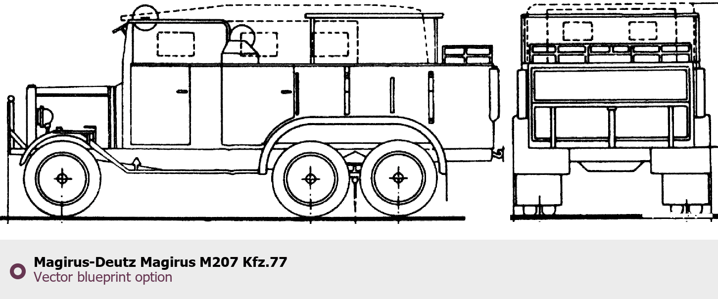 Raster blueprint of the Magirus-Deutz Magirus M207 Kfz.77 Heavy Truck. This free downloadable image can be used for graphic projects, digital design, and 3D modeling. The file provides accurate exterior proportions of the vehicle. Body type: Heavy Truck.