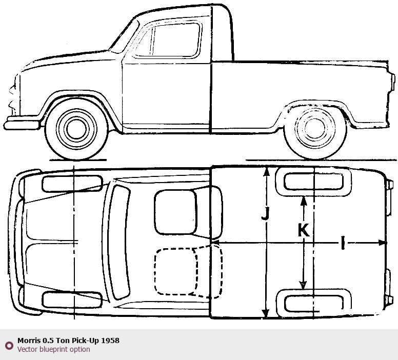 Raster blueprint of the 1958 Morris 0.5 Ton Pick-Up Pickup Truck. This free downloadable image can be used for graphic projects, digital design, and 3D modeling. The file provides accurate exterior proportions of the vehicle. Model year: 1958. Body type: Pickup Truck.