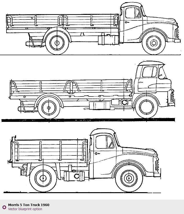Raster blueprint of the 1960 Morris 5 Ton Truck Heavy Truck. This free downloadable image can be used for graphic projects, digital design, and 3D modeling. The file provides accurate exterior proportions of the vehicle. Model year: 1960. Body type: Heavy Truck.