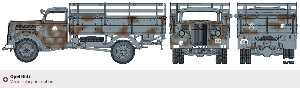 Raster blueprint of the Opel Blitz Heavy Truck. This free downloadable image can be used for graphic projects, digital design, and 3D modeling. The file provides accurate exterior proportions of the vehicle. Body type: Heavy Truck.