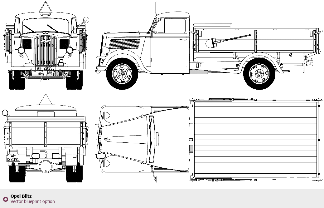 Raster blueprint of the Opel Blitz Heavy Truck. This free downloadable image can be used for graphic projects, digital design, and 3D modeling. The file provides accurate exterior proportions of the vehicle. Body type: Heavy Truck.