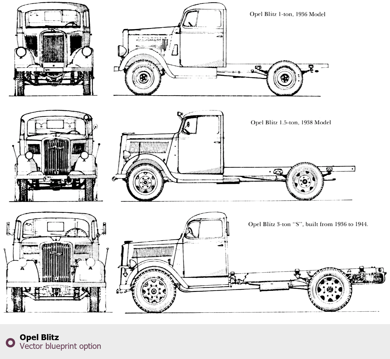 Raster blueprint of the Opel Blitz Heavy Truck. This free downloadable image can be used for graphic projects, digital design, and 3D modeling. The file provides accurate exterior proportions of the vehicle. Body type: Heavy Truck.
