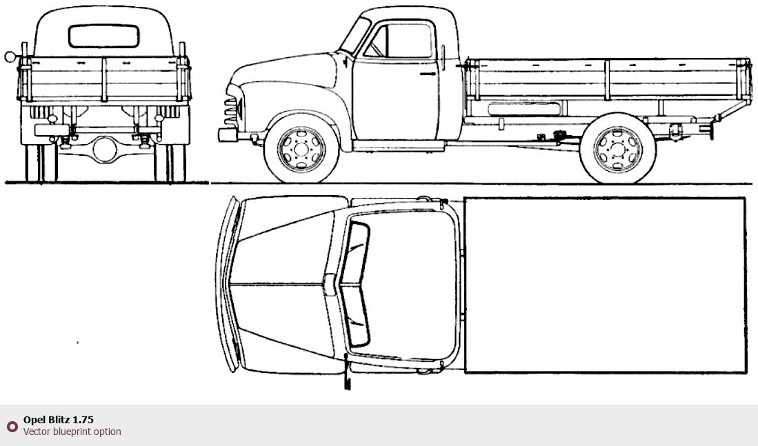 Raster blueprint of the Opel Blitz 1.75 Heavy Truck. This free downloadable image can be used for graphic projects, digital design, and 3D modeling. The file provides accurate exterior proportions of the vehicle. Body type: Heavy Truck.