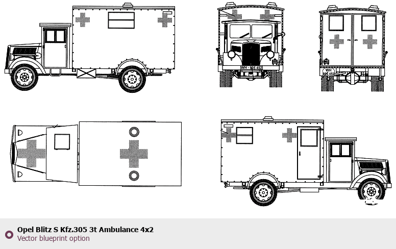 Raster blueprint of the Opel Blitz S Kfz.305 3t Ambulance 4x2 Heavy Truck. This free downloadable image can be used for graphic projects, digital design, and 3D modeling. The file provides accurate exterior proportions of the vehicle. Body type: Heavy Truck.