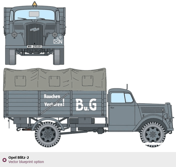Raster blueprint of the Opel Blitz-2 Heavy Truck. This free downloadable image can be used for graphic projects, digital design, and 3D modeling. The file provides accurate exterior proportions of the vehicle. Body type: Heavy Truck.