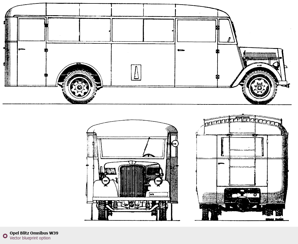 Raster blueprint of the Opel Blitz Omnibus W39 Bus. This free downloadable image can be used for graphic projects, digital design, and 3D modeling. The file provides accurate exterior proportions of the vehicle. Body type: Bus.