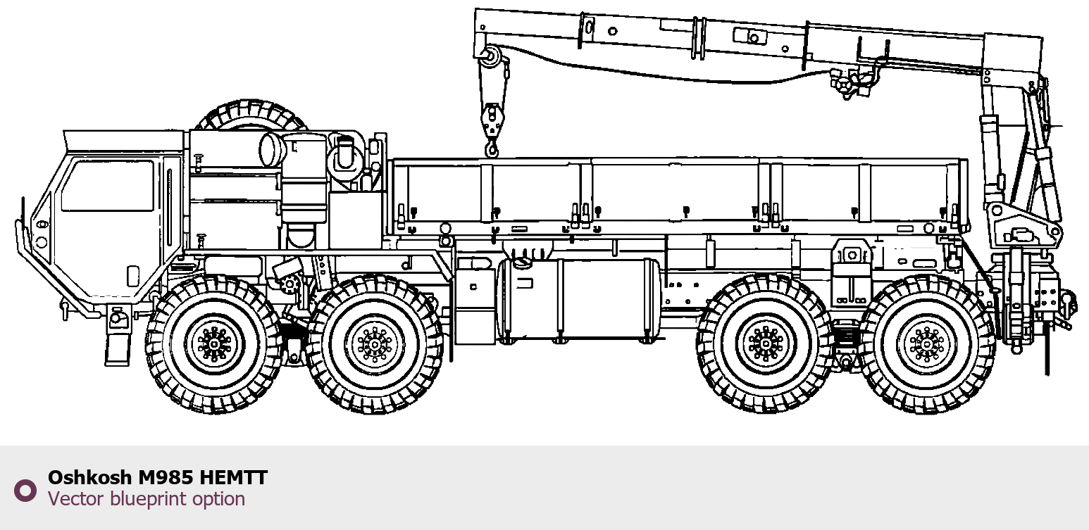 Raster blueprint of the Oshkosh M985 HEMTT Heavy Truck. This free downloadable image can be used for graphic projects, digital design, and 3D modeling. The file provides accurate exterior proportions of the vehicle. Body type: Heavy Truck.