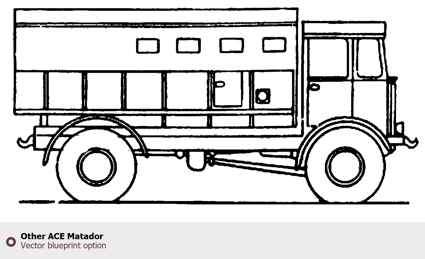 Raster blueprint of the Other ACE Matador Heavy Truck. This free downloadable image can be used for graphic projects, digital design, and 3D modeling. The file provides accurate exterior proportions of the vehicle. Body type: Heavy Truck.