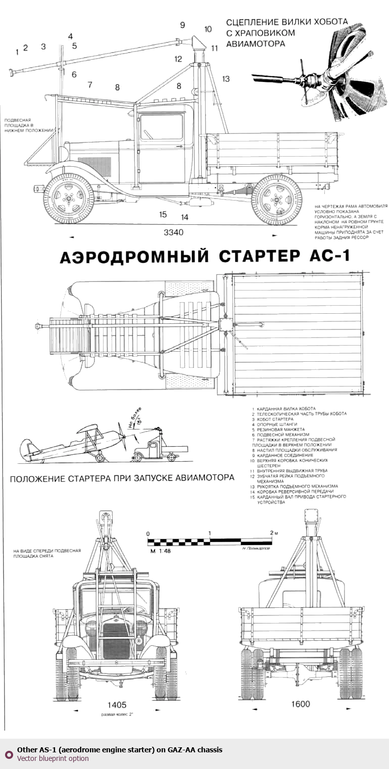 Raster blueprint of the Other AS-1 (aerodrome engine starter) on GAZ-AA chassis Heavy Truck. This free downloadable image can be used for graphic projects, digital design, and 3D modeling. The file provides accurate exterior proportions of the vehicle. Body type: Heavy Truck.