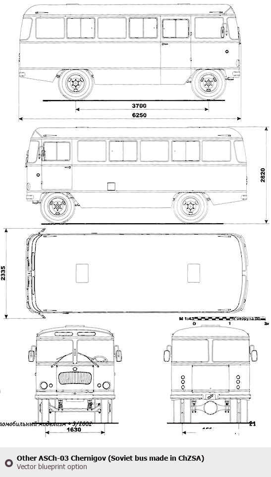 Raster blueprint of the Other ASCh-03 Chernigov (Soviet bus made in ChZSA) Bus. This free downloadable image can be used for graphic projects, digital design, and 3D modeling. The file provides accurate exterior proportions of the vehicle. Body type: Bus.
