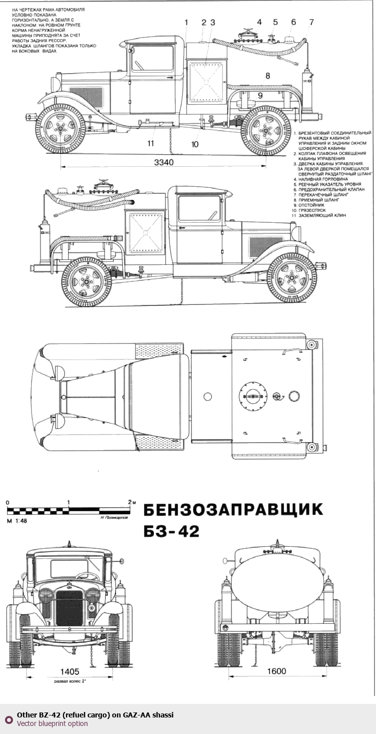 Raster blueprint of the Other BZ-42 (refuel cargo) on GAZ-AA shassi Heavy Truck. This free downloadable image can be used for graphic projects, digital design, and 3D modeling. The file provides accurate exterior proportions of the vehicle. Body type: Heavy Truck.