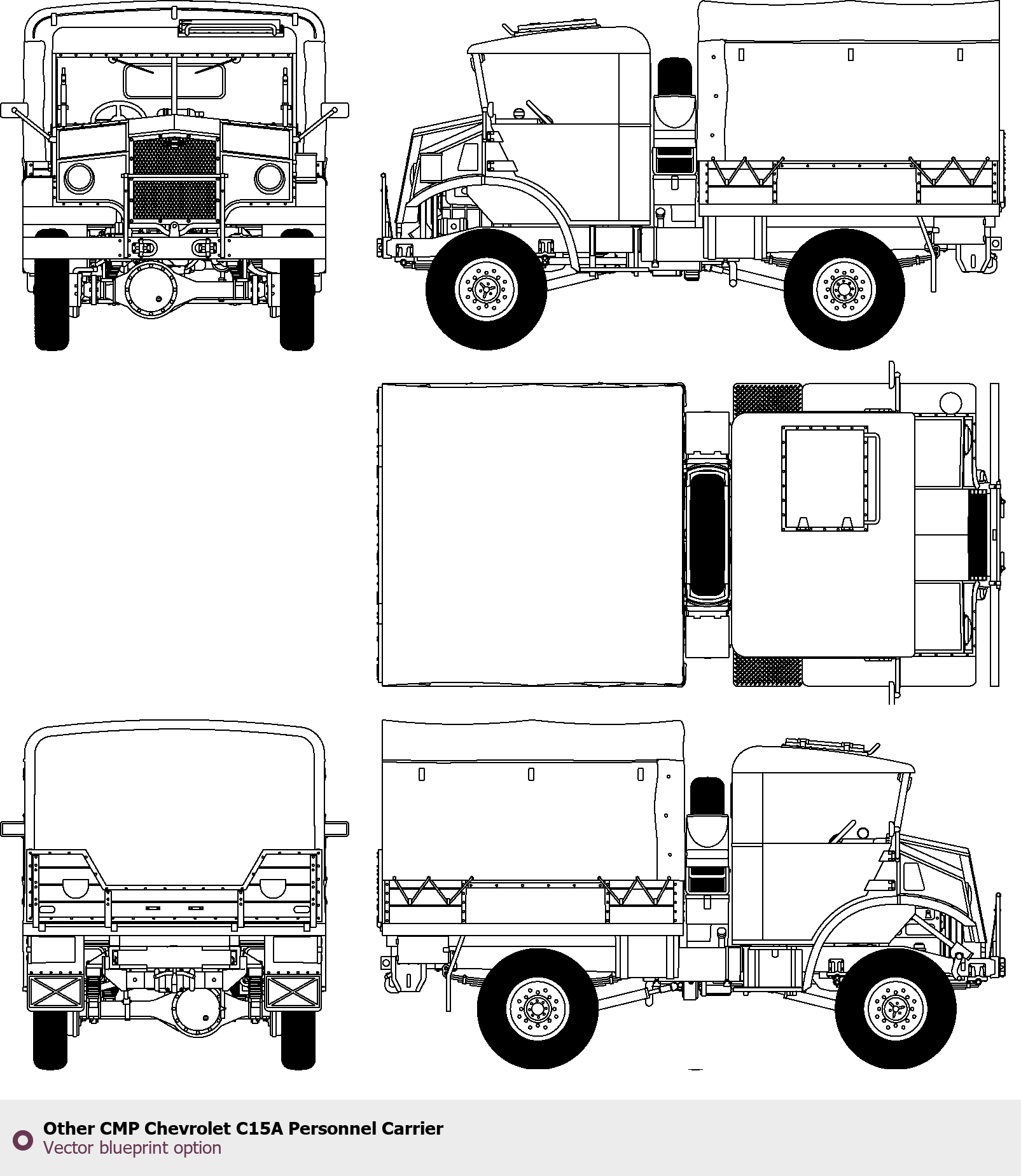 Raster blueprint of the Other CMP Chevrolet C15A Personnel Carrier Heavy Truck. This free downloadable image can be used for graphic projects, digital design, and 3D modeling. The file provides accurate exterior proportions of the vehicle. Body type: Heavy Truck.