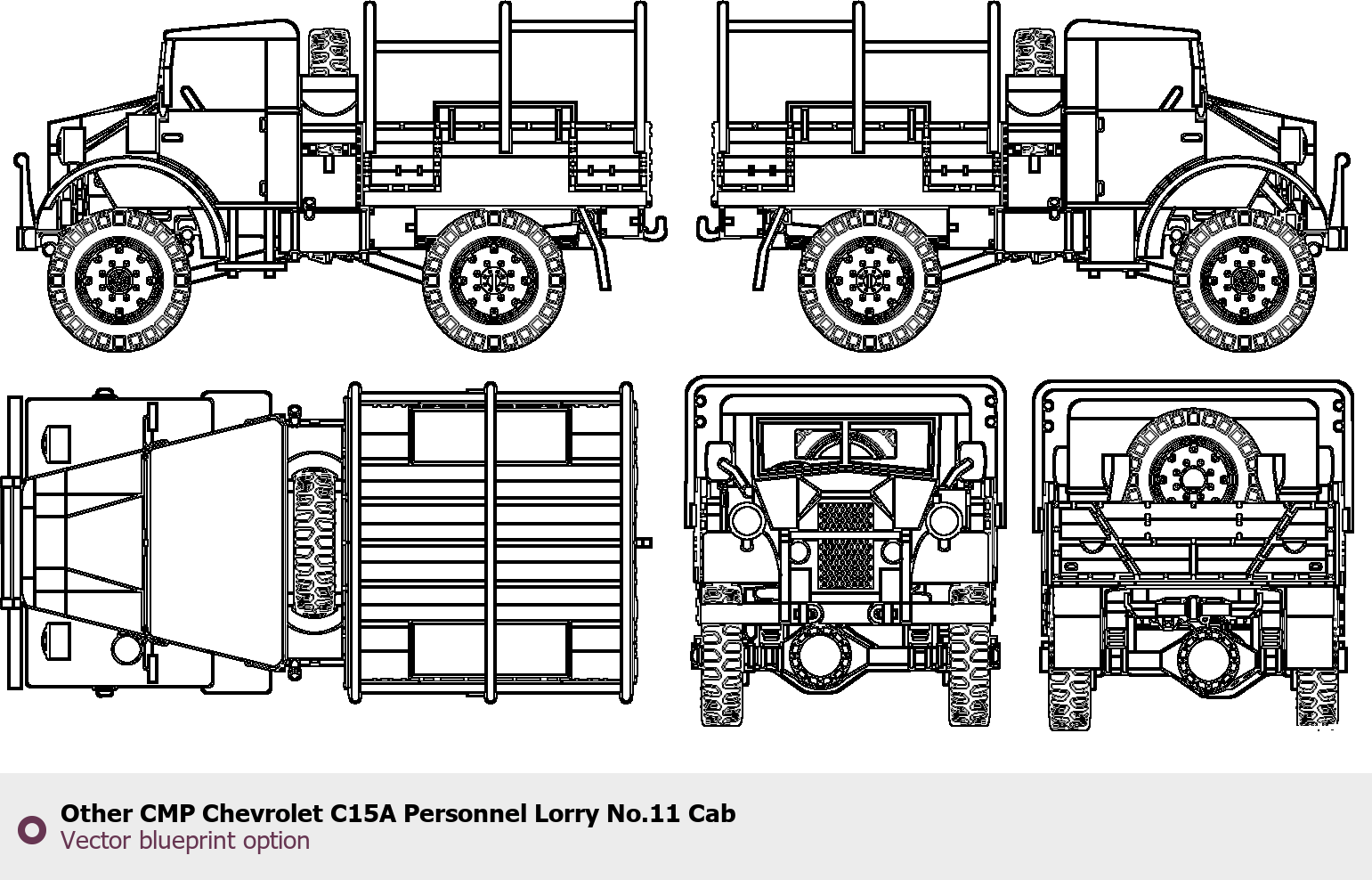 Raster blueprint of the Other CMP Chevrolet C15A Personnel Lorry No.11 Cab Heavy Truck. This free downloadable image can be used for graphic projects, digital design, and 3D modeling. The file provides accurate exterior proportions of the vehicle. Body type: Heavy Truck.
