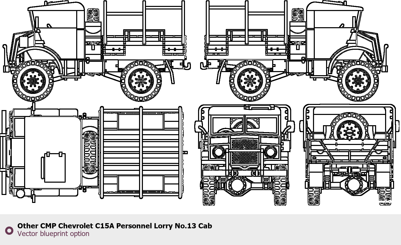 Raster blueprint of the Other CMP Chevrolet C15A Personnel Lorry No.13 Cab Heavy Truck. This free downloadable image can be used for graphic projects, digital design, and 3D modeling. The file provides accurate exterior proportions of the vehicle. Body type: Heavy Truck.
