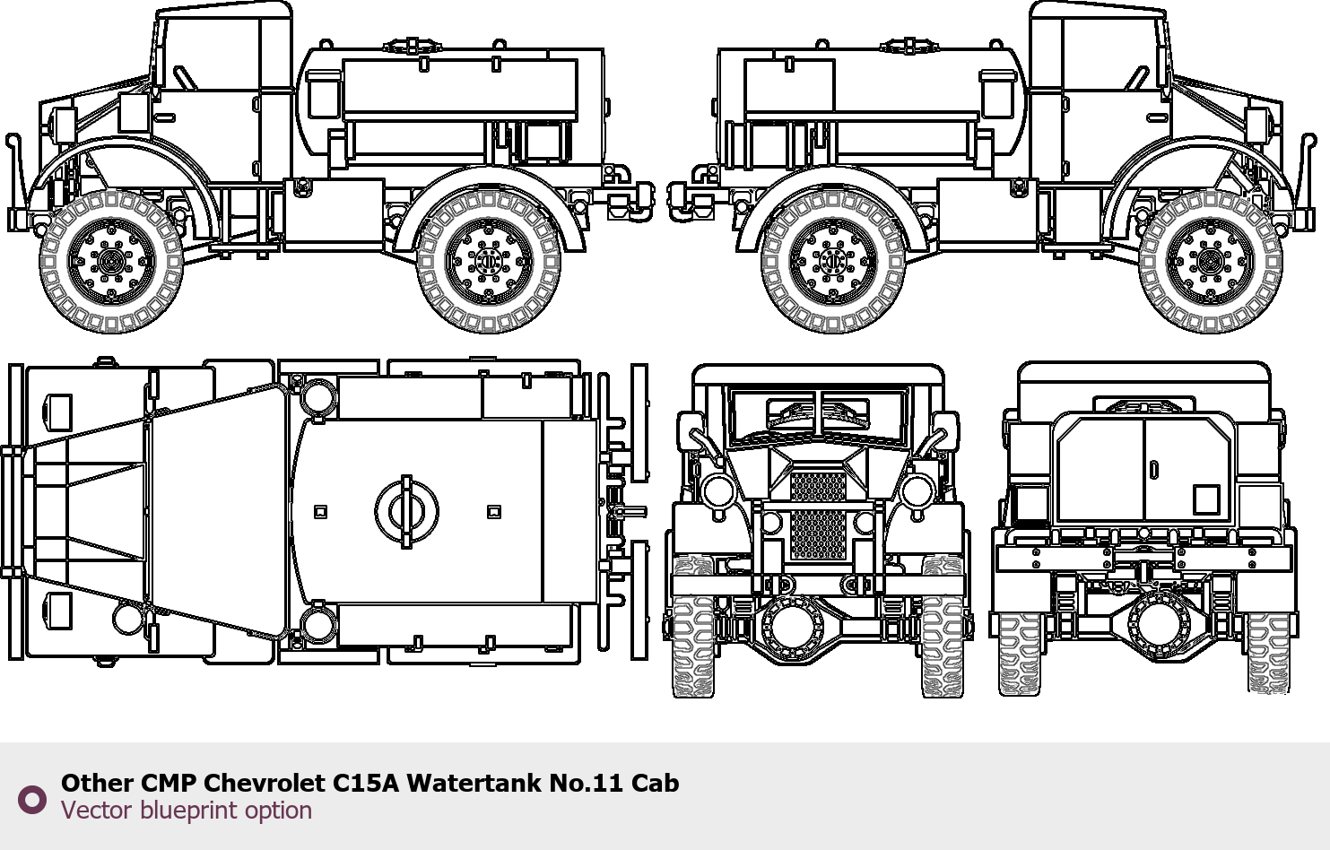 Raster blueprint of the Other CMP Chevrolet C15A Watertank No.11 Cab Heavy Truck. This free downloadable image can be used for graphic projects, digital design, and 3D modeling. The file provides accurate exterior proportions of the vehicle. Body type: Heavy Truck.