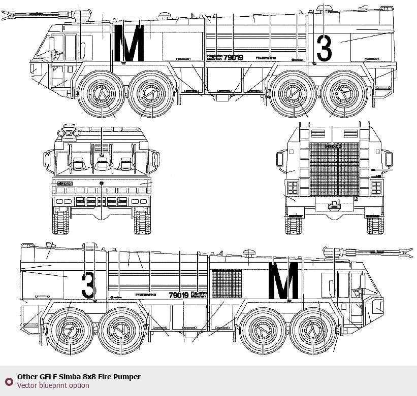 Raster blueprint of the Other GFLF Simba 8x8 Fire Pumper Heavy Truck. This free downloadable image can be used for graphic projects, digital design, and 3D modeling. The file provides accurate exterior proportions of the vehicle. Body type: Heavy Truck.