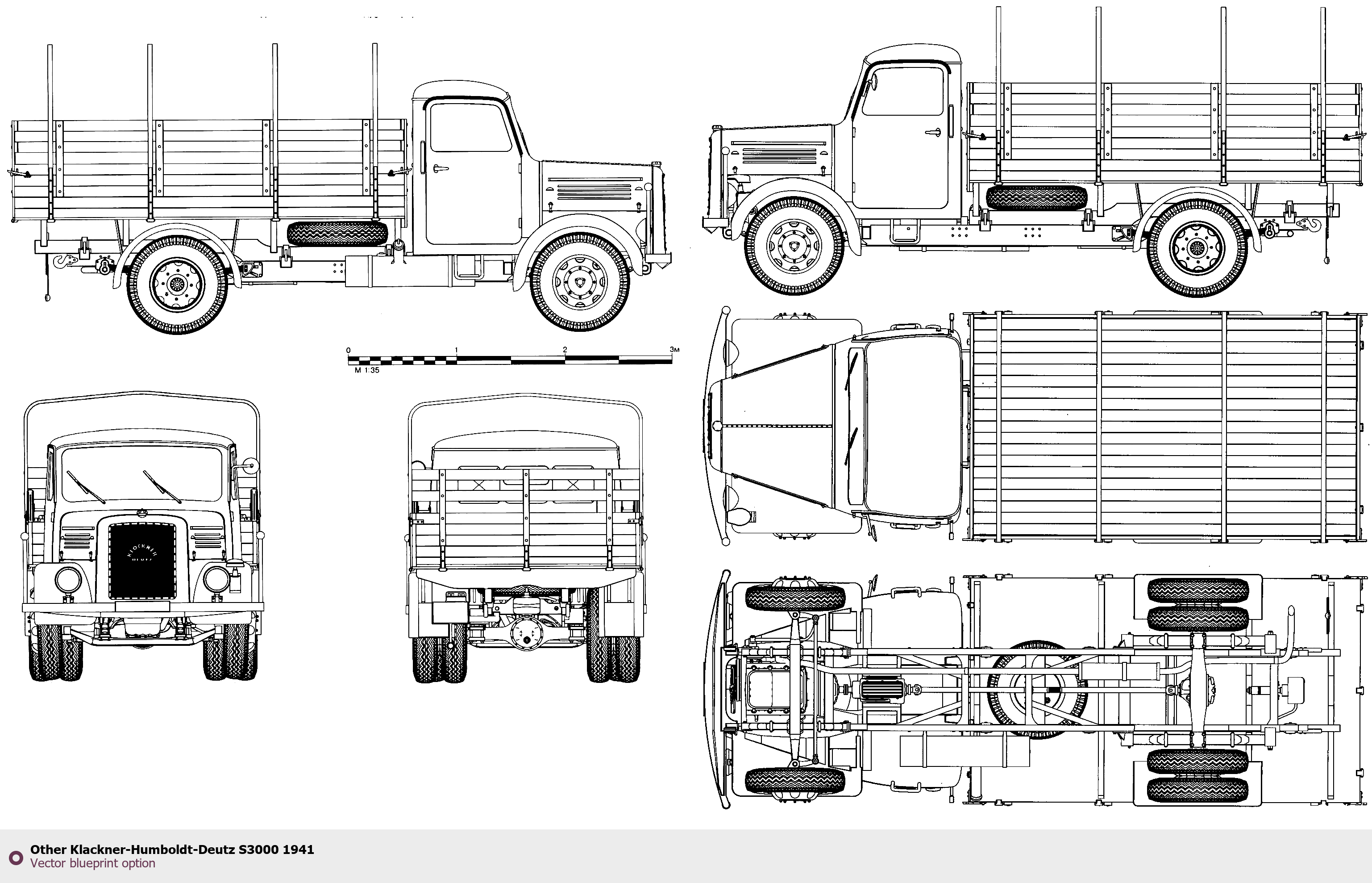 Raster blueprint of the 1941 Other Klackner-Humboldt-Deutz S3000 Heavy Truck. This free downloadable image can be used for graphic projects, digital design, and 3D modeling. The file provides accurate exterior proportions of the vehicle. Model year: 1941. Body type: Heavy Truck.