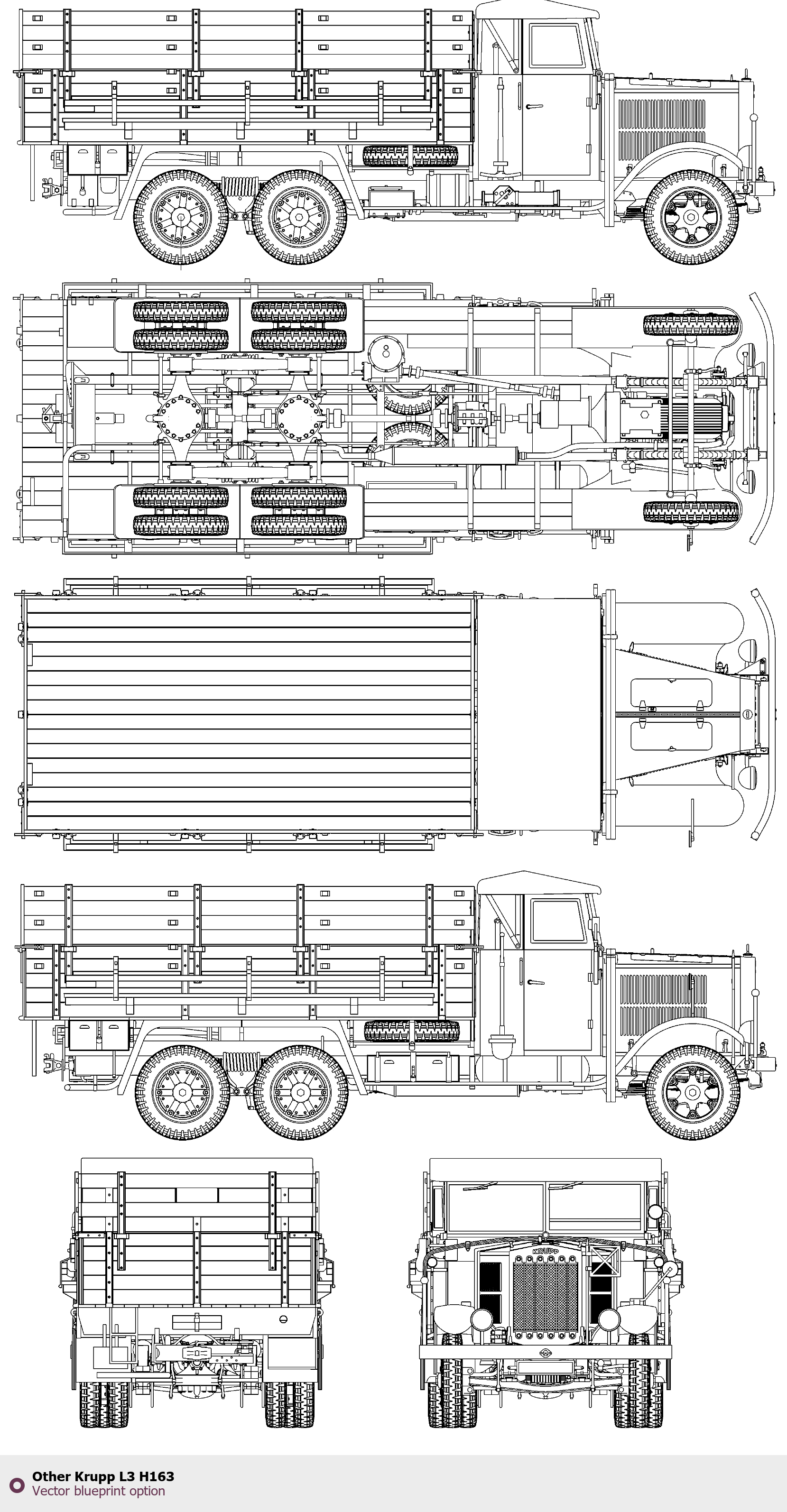 Raster blueprint of the Other Krupp L3 H163 Heavy Truck. This free downloadable image can be used for graphic projects, digital design, and 3D modeling. The file provides accurate exterior proportions of the vehicle. Body type: Heavy Truck.